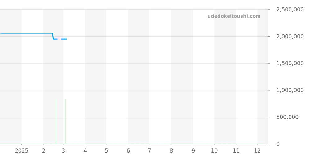 このページでは、IWCダヴィンチクロノグラフ IW376402の過去の相場変遷を表示しています。現在、IW376402には登録個体がありません。最後に登録された日(2025/03/06)の平均値は1,950,000です。2025/03/06時点の最安値は1,950,000で最高値は1,950,000。当時の平均値は、2個から算出しています。間近1年間で最も大きな下落変動は02月15日の-110,000(-5.34%)、上昇変動は07月14日の+236,500(+12.97%)。なお、このページでは最長1年間の相場推移を見ることができますが、プレミアム会員になると全期間(2017/07-)を閲覧することが可能です。