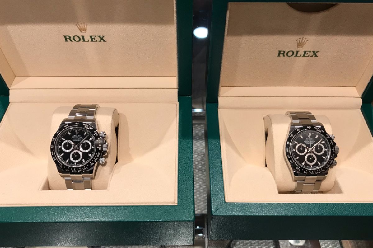 はい!こちらに2本の現行デイトナ”Ref.116500LN”の黒文字盤がございます。