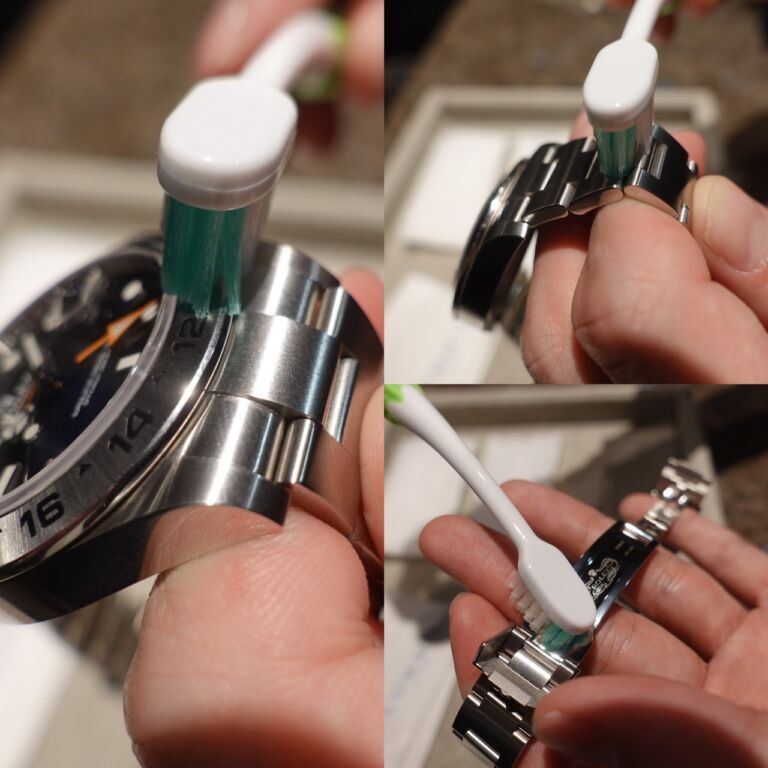 まずはじめに汚れが溜まりやすい、ベゼル、ケース、裏側の溝などをつまようじで掃除し、汚れを浮かします。あまり強くやると時計に傷がつく可能性があるので、優しくやるのがポイントです。ブレスレットに関しても、つまようじを使用しコマとコマの間や溝などの汚れをかきだします。