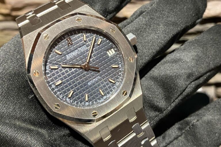 ブラックグレーにもネイビーにも見えるダイヤルが魅力的な36mmロイヤルオーク。