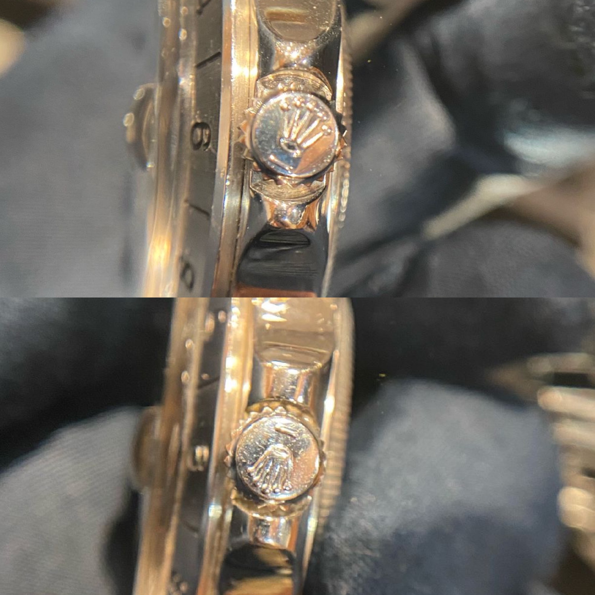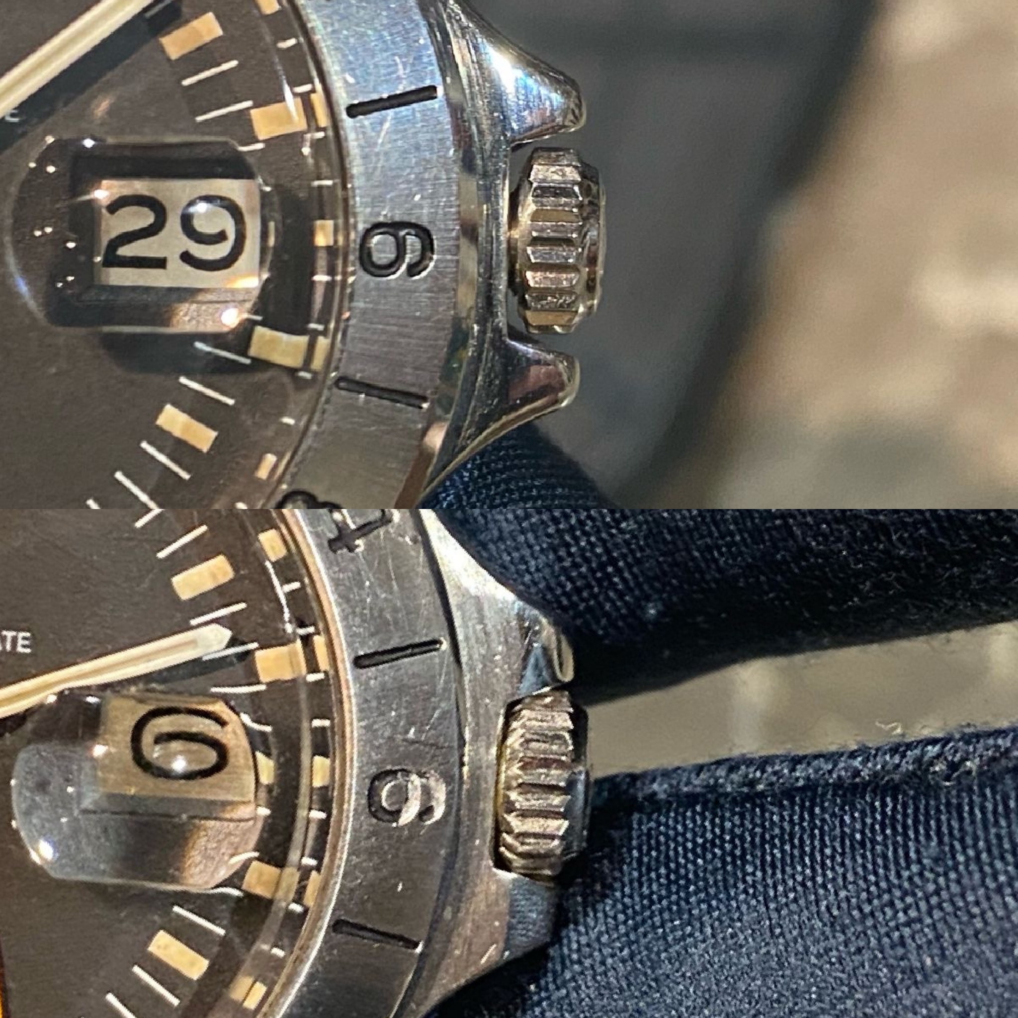 初期ケース(上)は尖がったリュウズガードが特徴ですね!