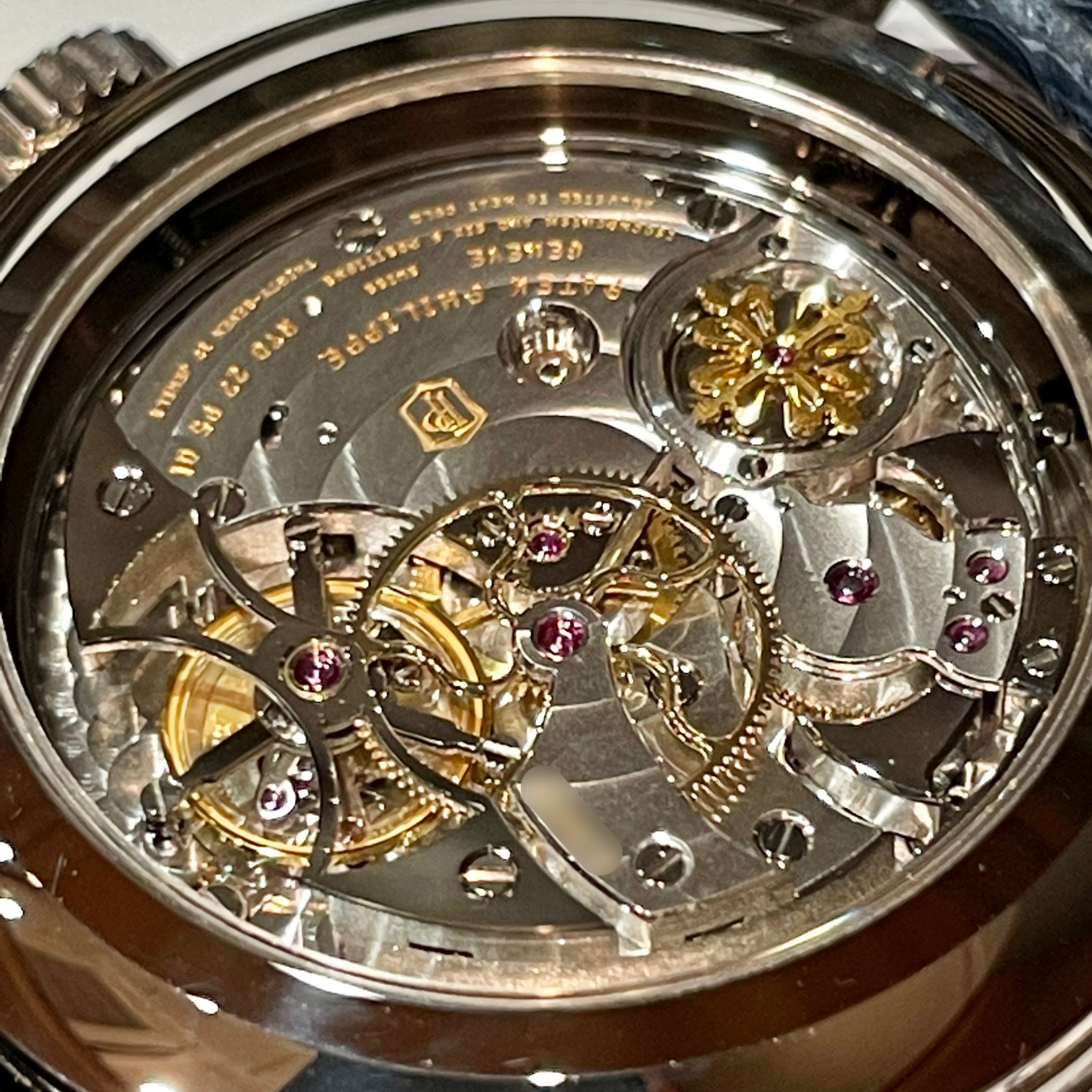 続いてムーブメント。とにかく美しいの一言に尽きますね。テンプは60秒間で1回転するトゥールビヨン。これにより姿勢差を打ち消し、高い精度を誇ります。そして写真右の二つのハンマーでムーブメント外周を囲むゴングを打ち、音色で時を知らせるミニット・リピーター。