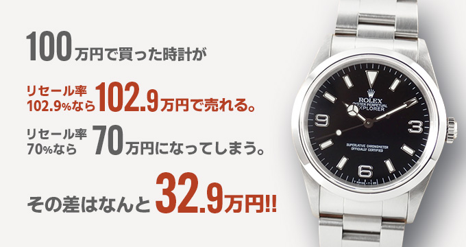 まず初めに、ご存知の方も多いかとは思いますが、一度買った時計を再度売りに出した時の価格差から導かれる数値を《買い戻し率=リセール率》と言い、一般的な買取店では、その数値が約70%と言われています。