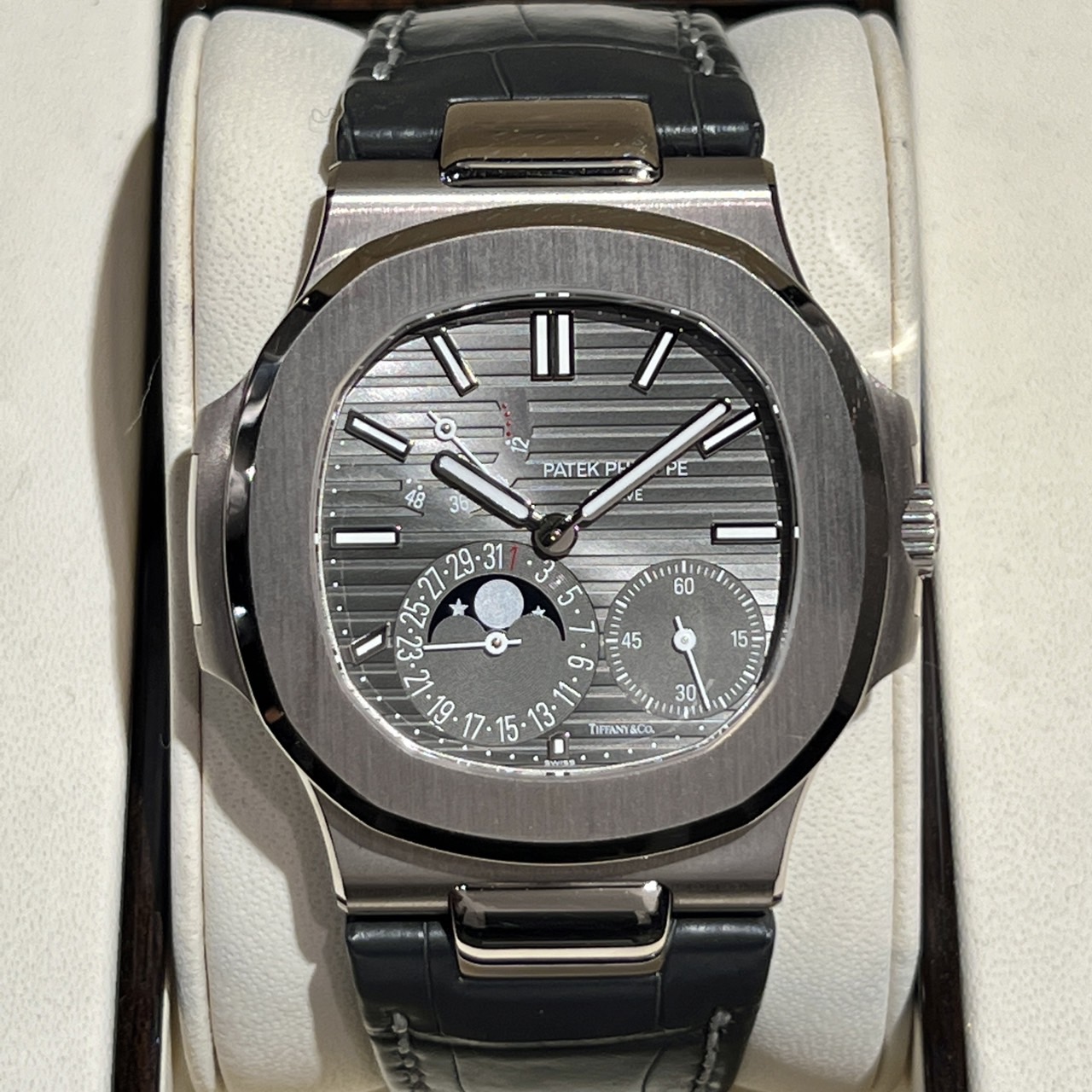 『ノーチラス』生誕30周年記念となる2006年、18KWG(ホワイトゴールド)ケース×アリゲーターベルト仕様で登場した『ノーチラス プチコンプリケーション』「Ref.5712G-001」。