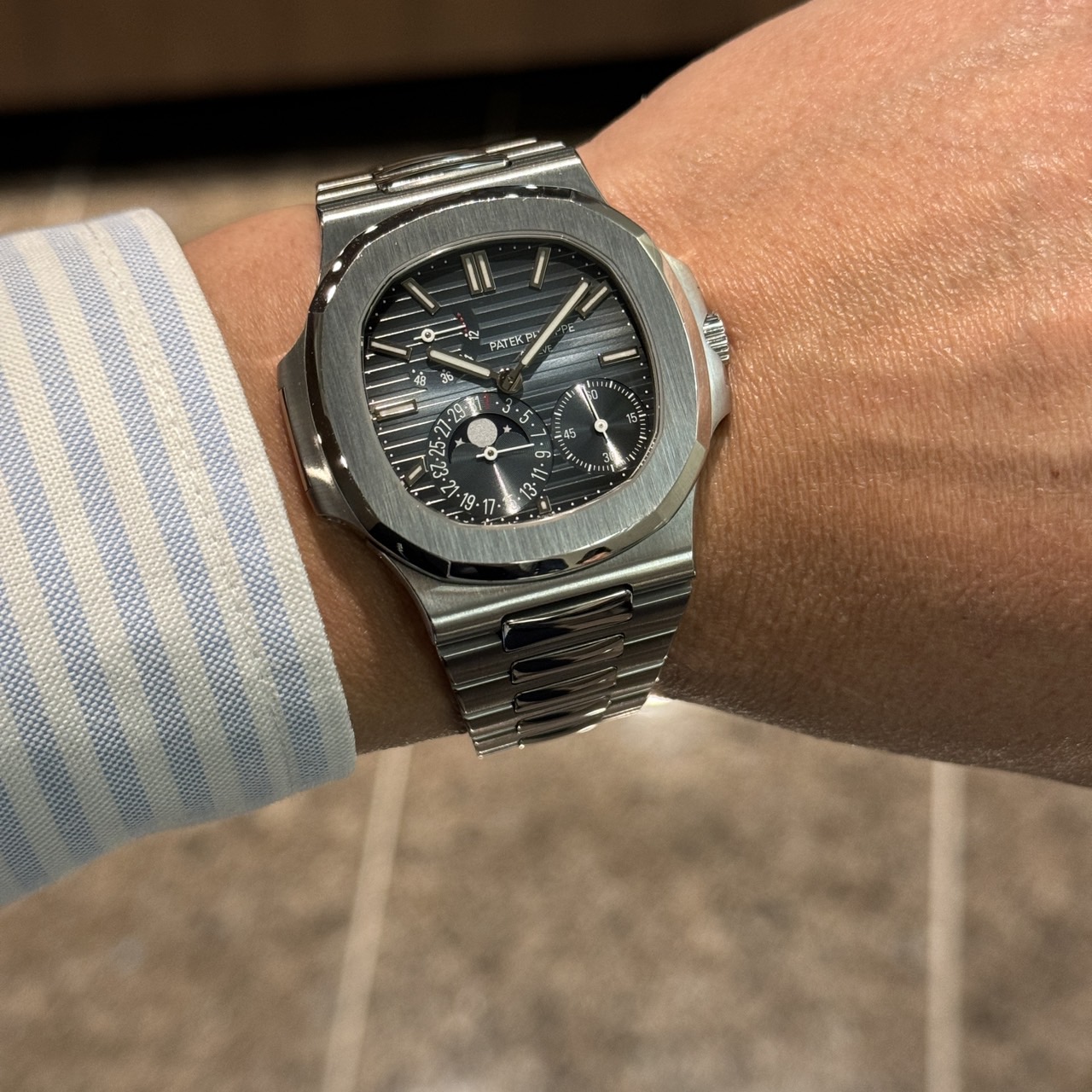 ケース径は40mm、厚さ8.3mmと、腕の納まりが良く、シャツでもストレスなくご使用いただけます。また、腕馴染みの良いブレスレットの作りもさすが【パテックフィリップ】といったところで、重さも約120gと、デイリーユースにも適していますね。