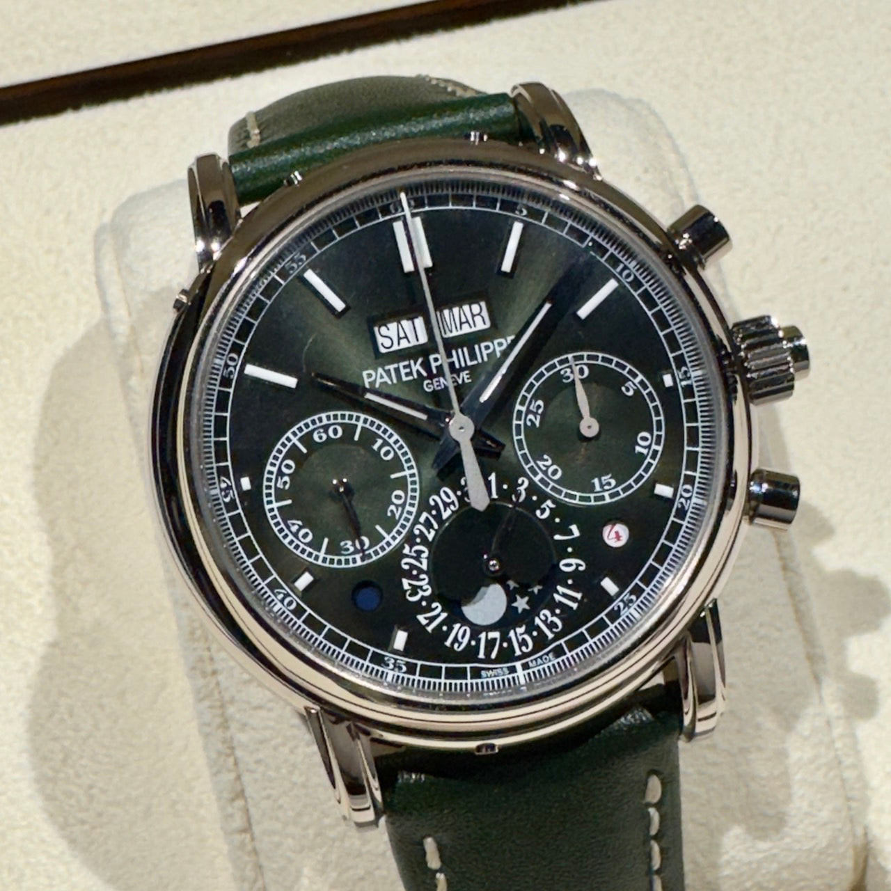 今回ご紹介の「Ref.5204G-001」は、現存している唯一の『パーペチュアルカレンダー スプリットセコンド クロノグラフ』であり、私の中ではもはや完成形であるとも思っております。外周に向かって濃くなっている、ブラックグラデーションのオリーブグリーンソレイユ文字盤は、ただシンプルに”カッコ良い”との一言に尽きますね。