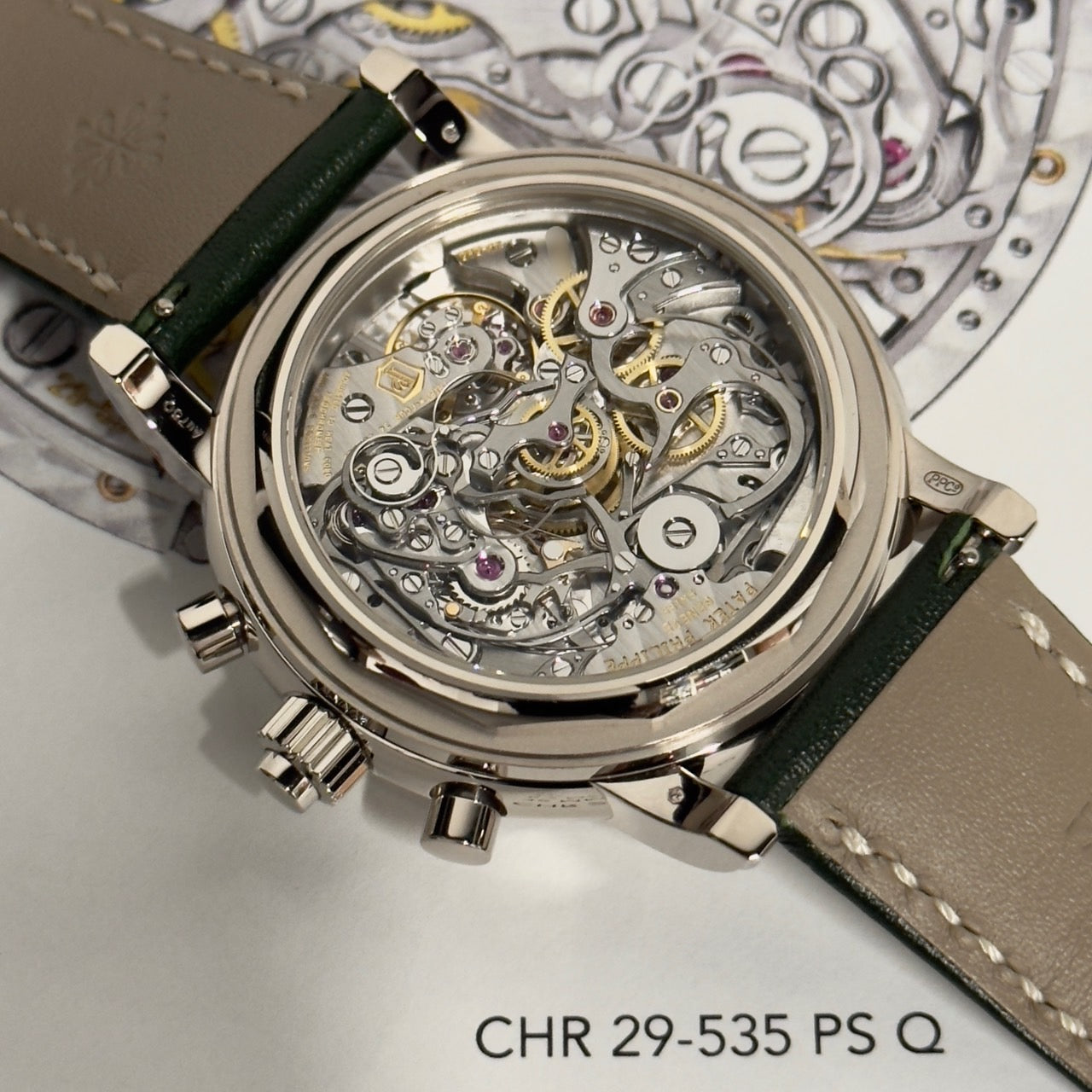 スケルトンバックから鑑賞いただけるムーブメントは、完全自社開発・製造の「Cal.CH 29-535 PS Q」。一つ一つのパーツの仕上げが丁寧で細かく、【パテックフィリップ】の伝統と技術力の高さを感じることができます。