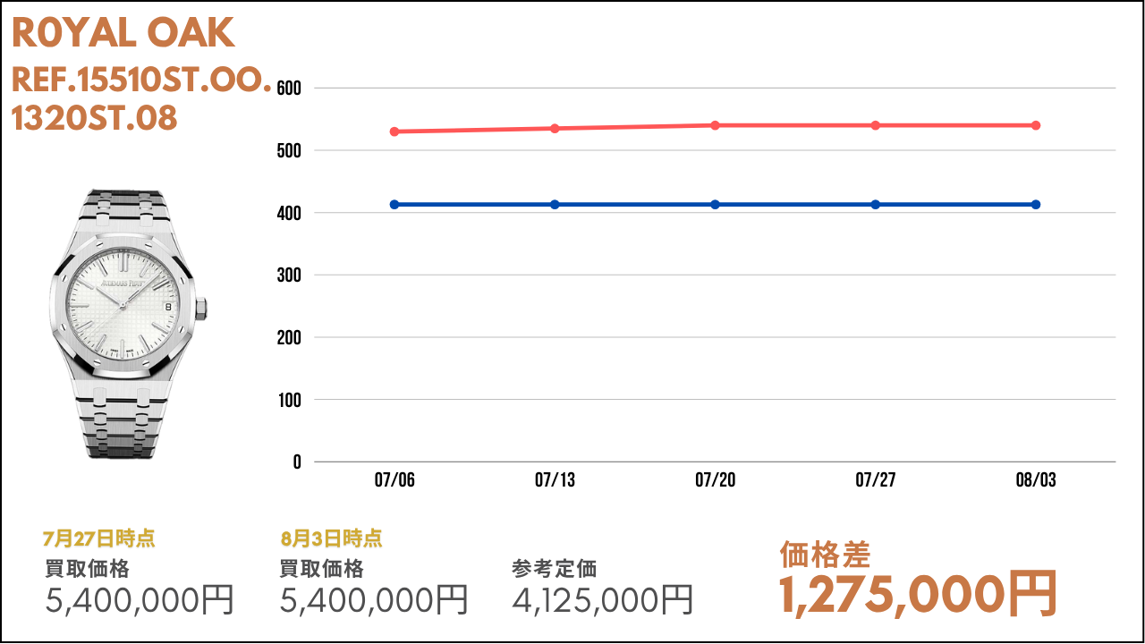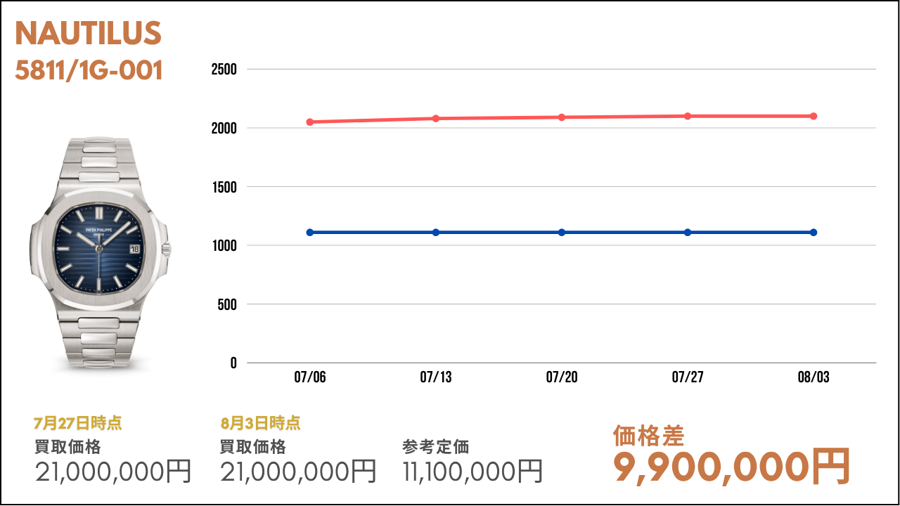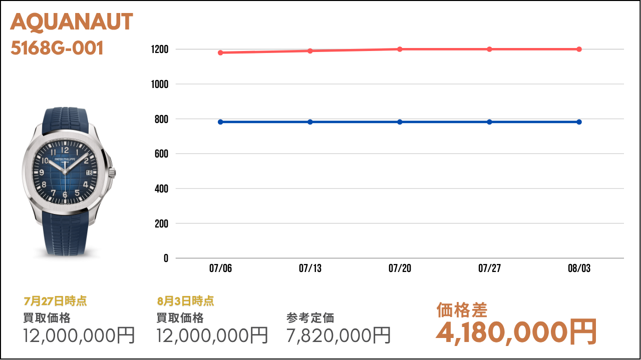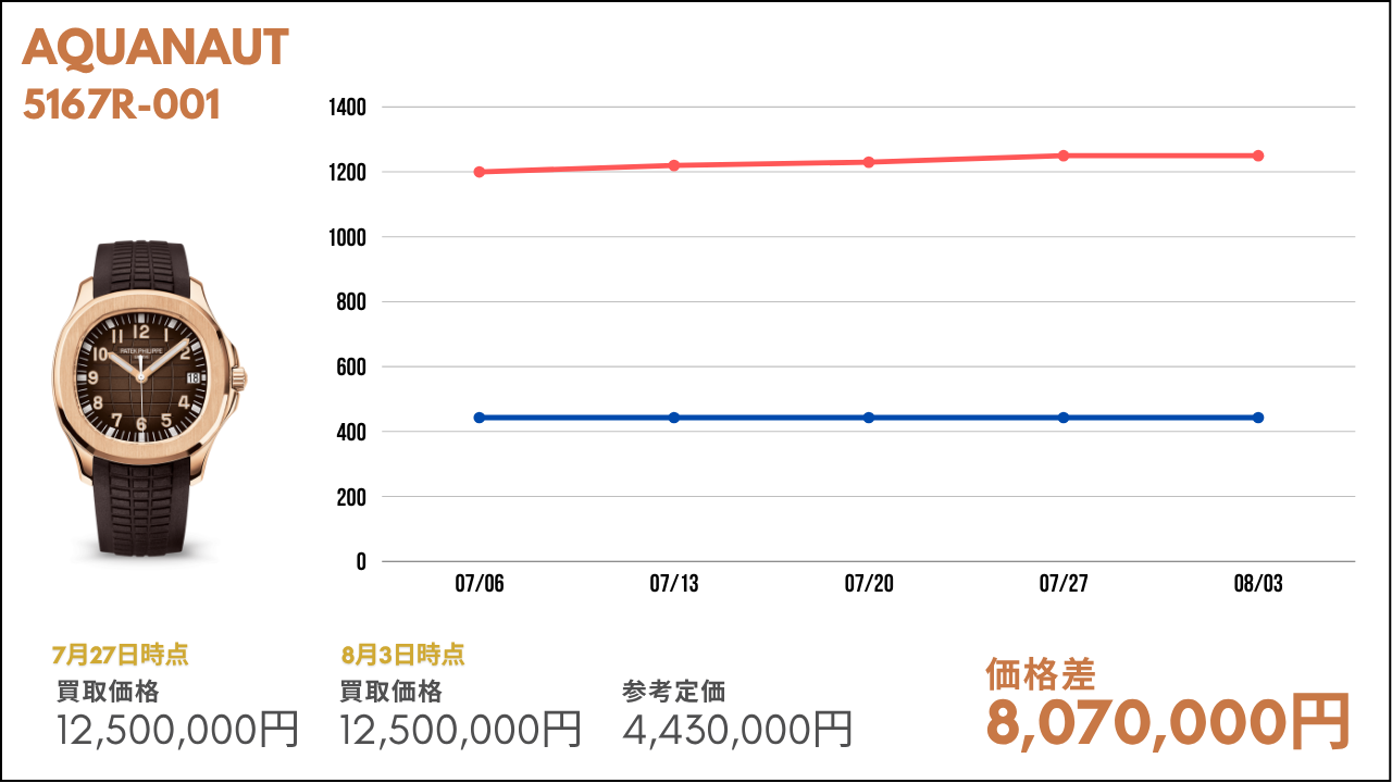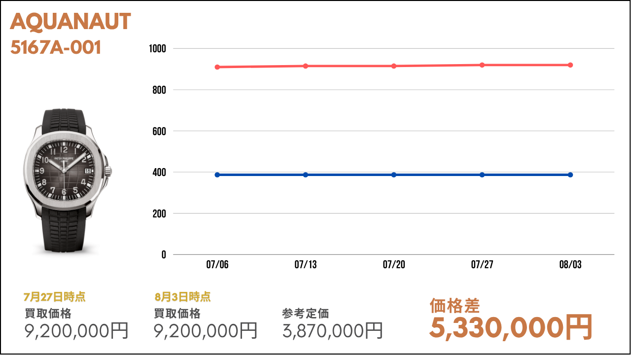 比較的、安定した動きを見せている高額帯モデル。特にノーチラスやアクアノートなどは定番で人気のため高い水準を維持している状況です。今後も定期的に今回ご紹介したモデルたちも紹介していきますので、ぜひ楽しみにお待ちいただければと思います。