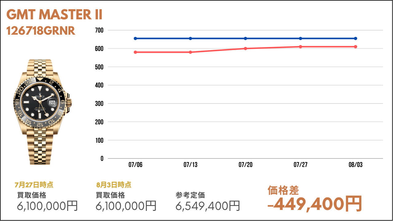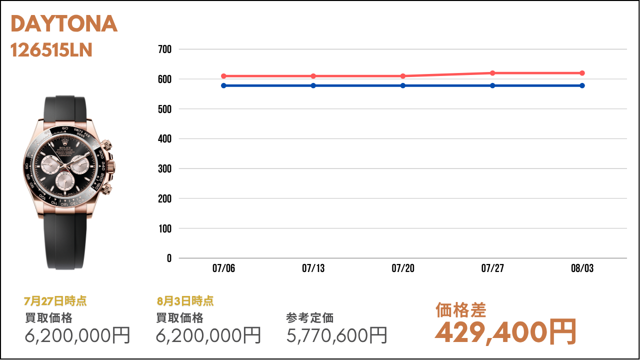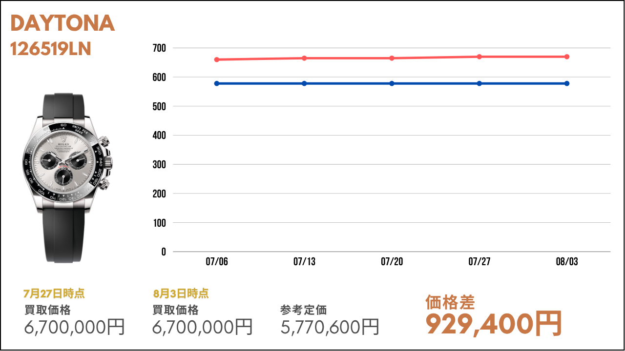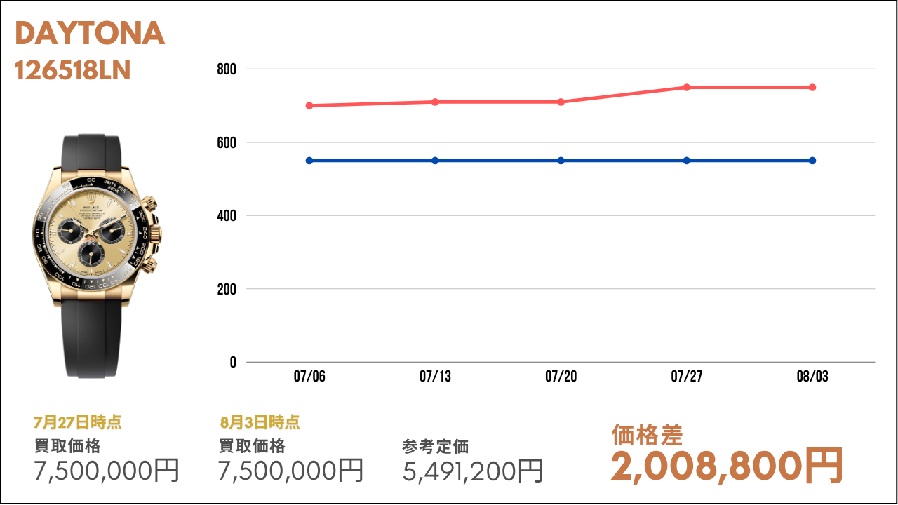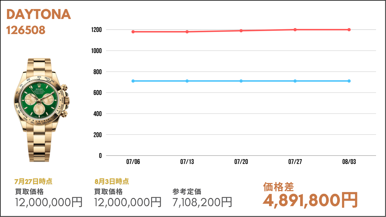 その市場価値が毎週どのように変動しているかを知ることは、時計愛好家や投資家にとって非常に重要な要素の1つです。本コラムでは、ロレックスの金無垢モデルや世界三大時計ブランドの主要モデルの相場について、その定価と毎週の買取金額を比較し、最新の市場トレンドをお届けします。ぜひ売買のご参考にしていただければと思います。また、毎週こちらの内容を配信していきますので、欠かさずチェックしてください!