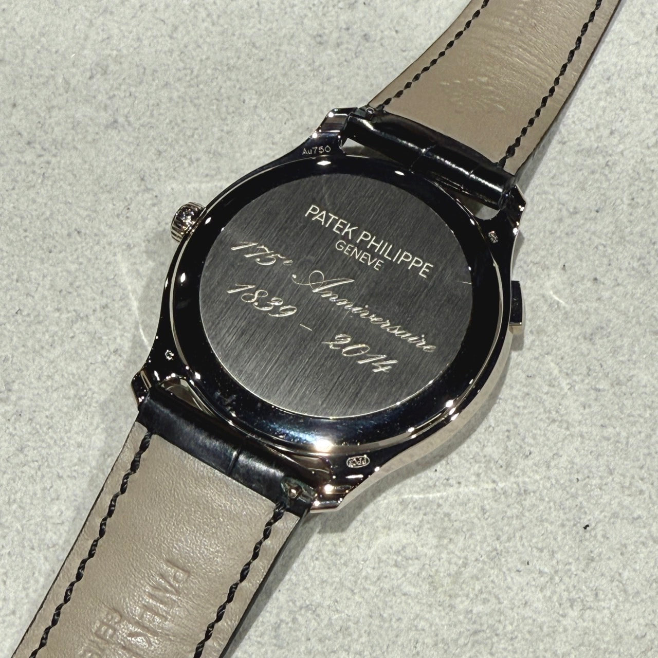 この創業175周年記念モデルは、裏蓋の仕様も特別で、クローズド仕様の裏蓋には、三行にわたり”PATEK PHILIPPE GENEVE”、”175 Anniversaire”、”1839 – 2014″と刻印されています。ちなみに、”ワールドタイム”に”ムーンフェイズ”を組み合わせたムーブメント「Cal.240 HU LU」を、サファイアクリスタルのシースルーバックから眺めてみたいと思った方もいらっしゃるのではないでしょうか。この気持ち、時計好きの方ならきっと共感していただけると思います。(笑)
