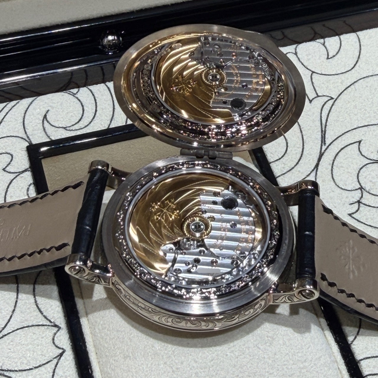 裏蓋とは異なるデザインが採用されている理由は明らかではありませんが、こうした点からも【パテックフィリップ】ならではの強いこだわりや、上質な遊び心が感じ取れますね。